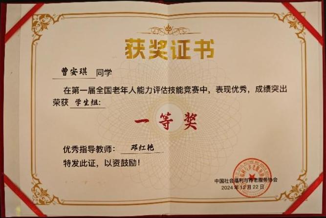 罗椅民教授作为中国老年大健康智库专家委员会委员、高级辅助器具康复工程师,自2024年成为太阳集团城8722柔性引进专家以来,为太阳集团城8722的应用型人才培养、专业建设和科研发展等工作发挥了重要作用。曹安琪同学作为公司2023级智慧健康养老服务与管理专业的一名员工,凭借自身扎实的理论基础和实践技能在2024年第一届全国老年人能力评估技能竞赛决赛中成为一等奖获得者。