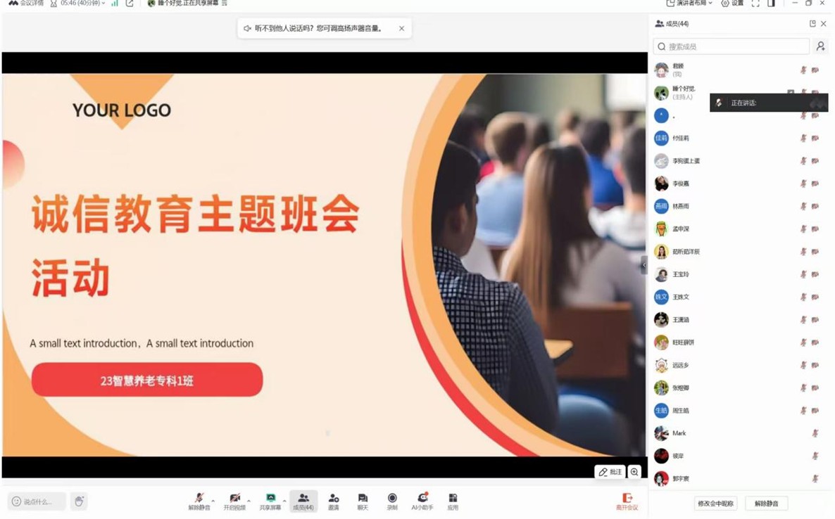 班会上,各班主讲人结合PPT、动画短片,聚焦学术诚信、考试纪律、网贷规范及就业履约等关键领域详细阐释了诚信的时代价值和深刻内涵,着重强调诚信不仅是个人立身之本,更是社会和谐发展的基石,并呼吁同学们要以诚信为准则规范自身行为,树立严谨的学术态度。班会结束后,同学们纷纷表示受益匪浅,对诚信有了更深刻的感悟,并承诺将从个人出发、从细微处着手,塑造诚实守信的高尚品格。
