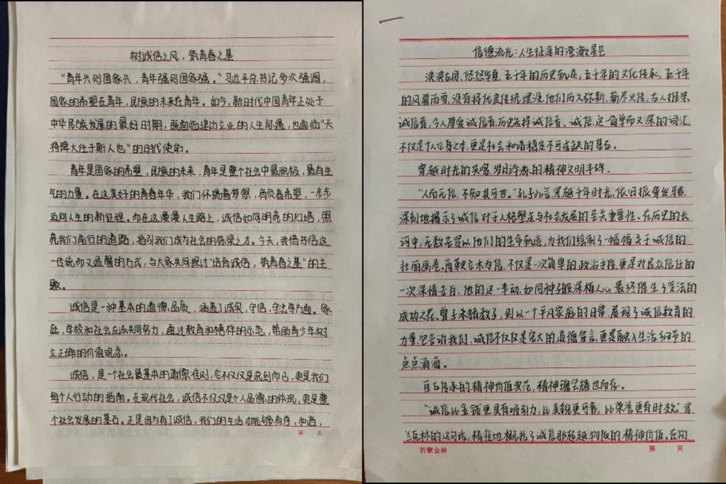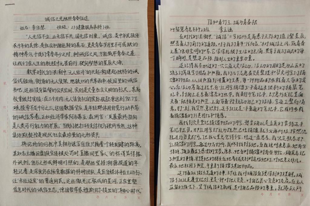 作品征集期间,同学们踊跃报名、积极参赛。参赛者紧密结合自身经历以及生活中的所见所闻,以校园生活、社会实践中的诚信故事为抓手,围绕诚信考试、学术诚信、人际交往诚信等话题,深入剖析诚信内涵,分享个人对诚信的感悟。评委从主题契合度、思想内容、创新性等方面进行综合评分,最终,将李佳慧、李玉涵等十名同学的征文推荐参加校赛。