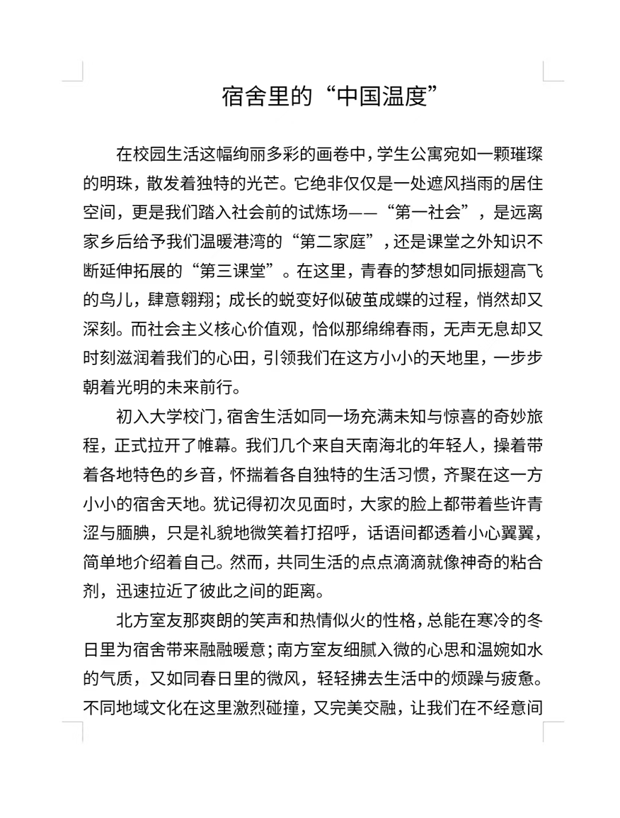 经过评选,24智慧养老专科2班冯艺凡的征文作品《宿舍里的“中国温度”》脱颖而出。该作品通过讲述不同地域室友文化的碰撞与融合,以及室友间在打扫卫生、考试复习、日常节约和公益活动等方面的相互理解和支持,生动展现了宿舍生活的温暖与和谐,传递了积极向上的生活态度和价值观。